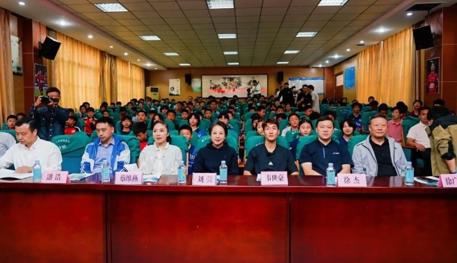 随后,活动进入授旗环节。国家体育总局徐杰、安徽省体育局副局长刘弢为省青少年足球集训队、"631"班授予班牌;韦世豪则为班级授予班旗,这标志着校园足球发展又注入了新的活力。在签名环节,省队班、"631"班的部分同学以及学校准备的物品,都得到了韦世豪的签名,现场秩序井然。